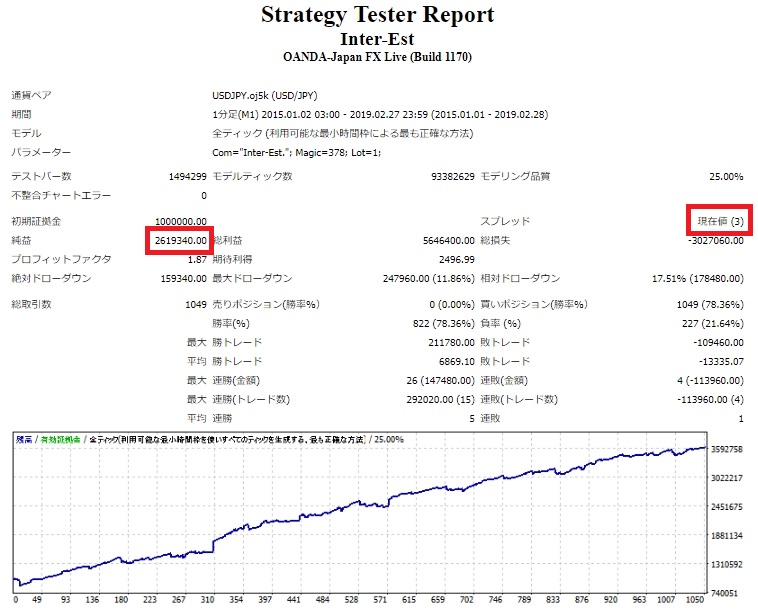 ではスプレッドが変わればどれくらい利益が変わるのか、当社のEA「Inter-est.」を例に見てみましょう。